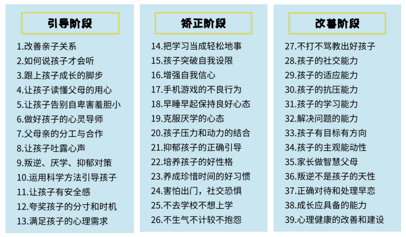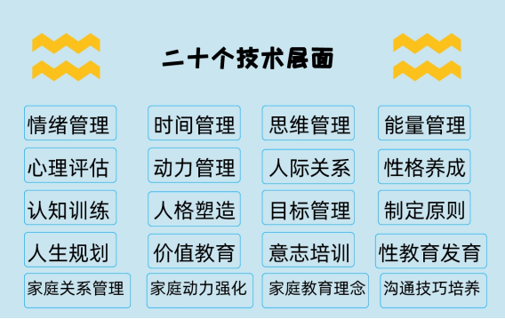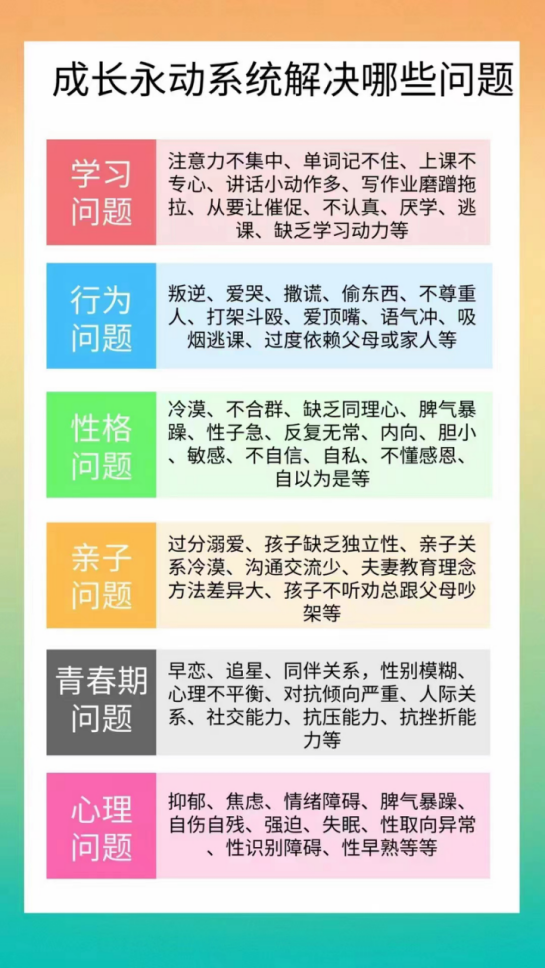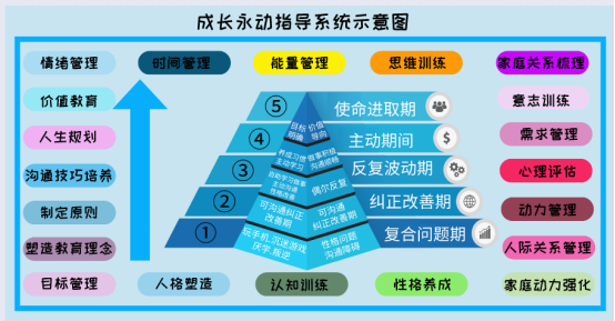 通过六大科学联合统一,结合十四种心理疗法,领先执行12个行业金标准,在20个层面,39个步骤和超过100个指导细节分三个阶段去执行,全面系统解决青少年成长中遇到的难题,让每个家庭,每个孩子拥有幸福的支撑点和永动力。